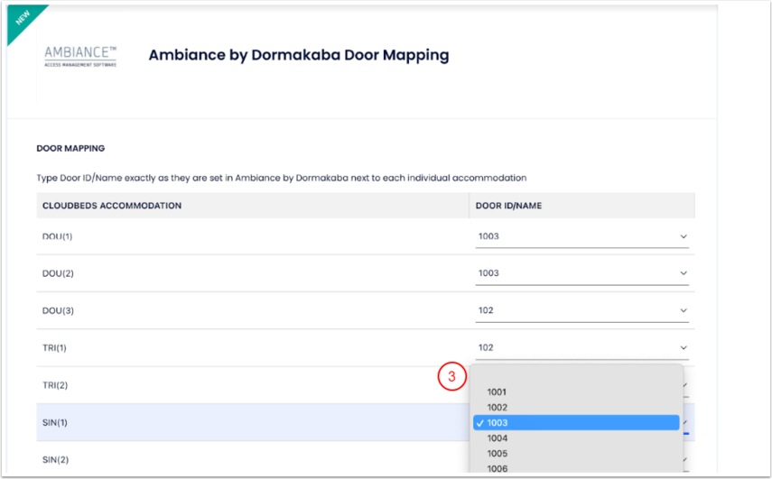 Cloudbeds, hangi konaklamanın Dormakaba’daki hangi kapıya karşılık geldiğini bilmelidir. Sonraki adım, Cloudbeds’teki konaklama birimlerini Ambiance’daki kapı adıyla eşleştirmektir.