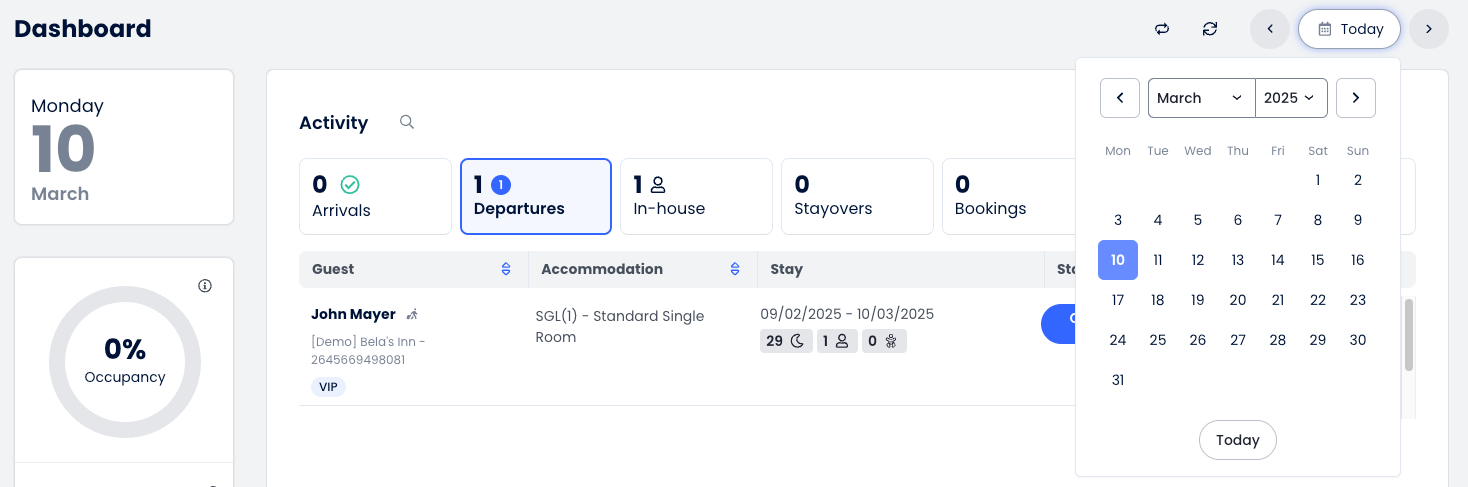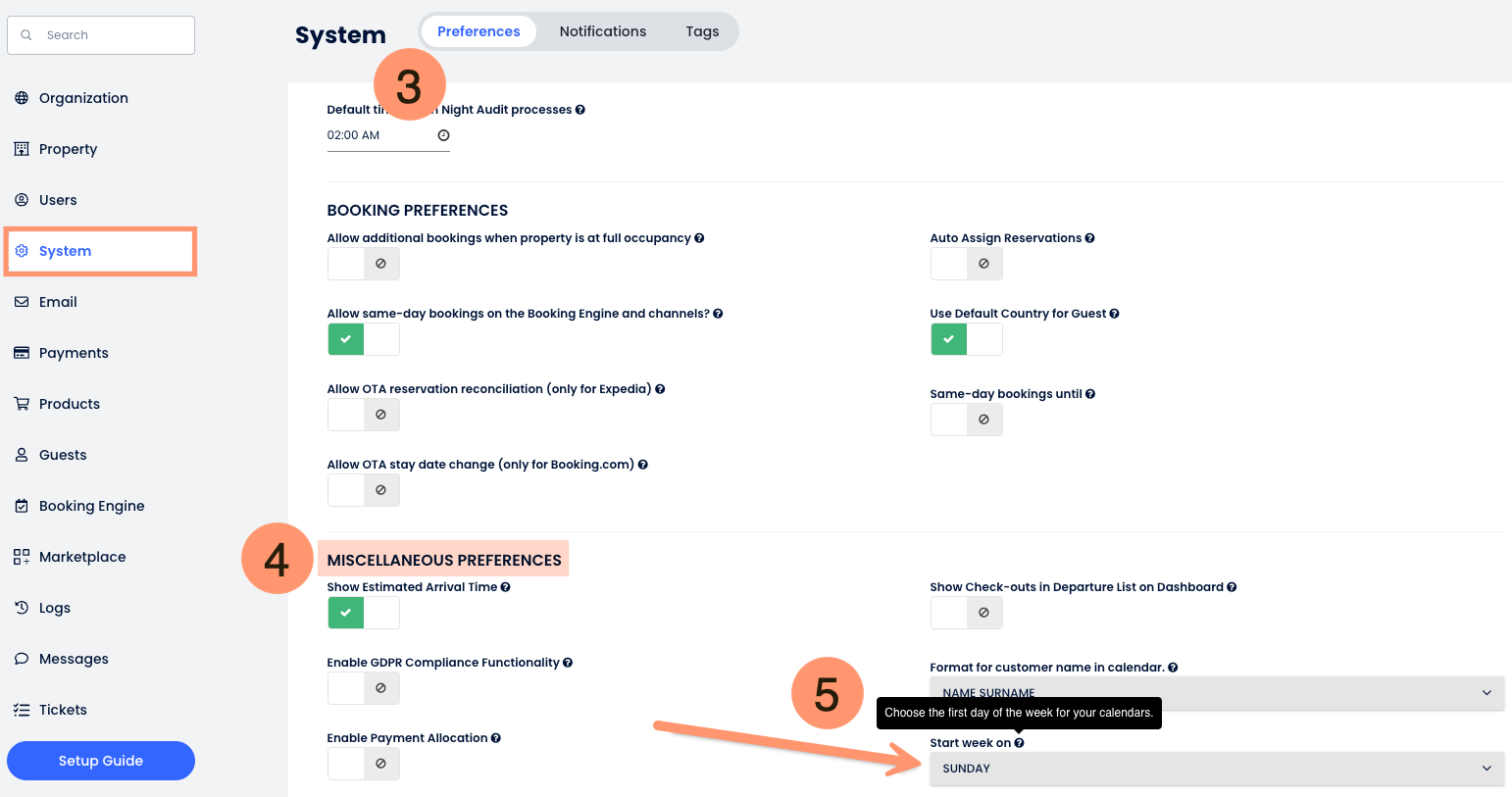 Cloudbeds PMS artık tesislerin sistem genelindeki takvimlerde haftanın başlangıç gününü değiştirmesine olanak tanıyan yeni bir ayar içeriyor. Haftanın Pazar (varsayılan), Pazartesi veya Cumartesi başlamasını seçebilir, böylece takvimlerin, programların ve haftalık raporlamanın bölgesel ve operasyonel uygulamalarla uyumlu olmasını sağlayabilirsin.