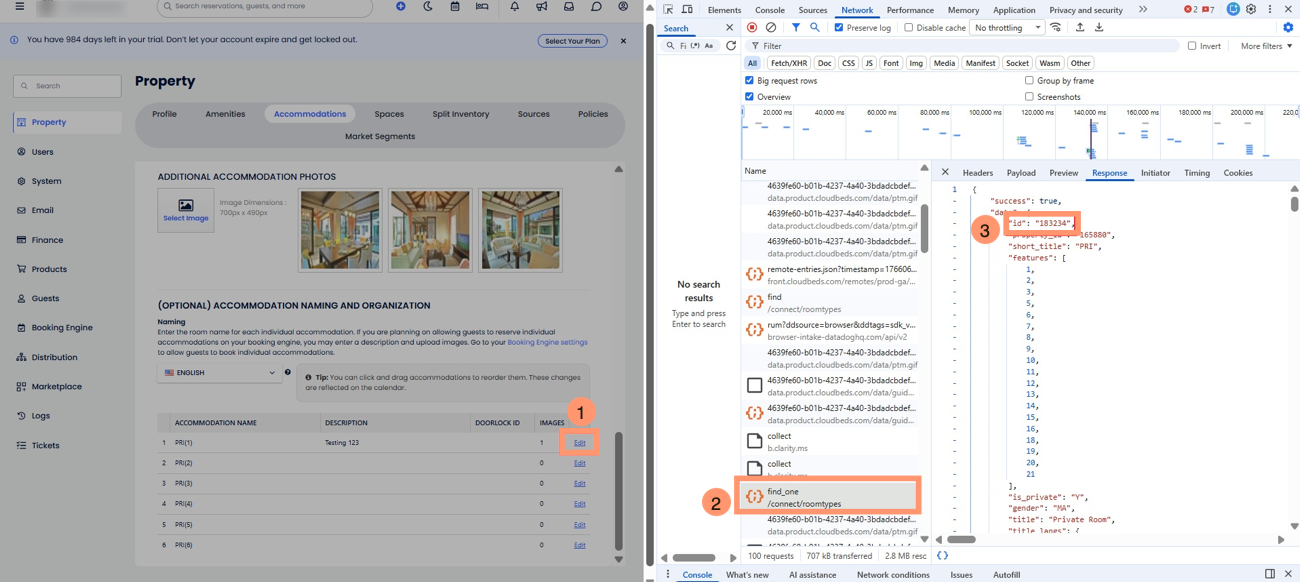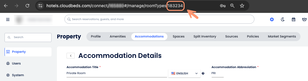Örneğin, https://hotels.cloudbeds.com/connect/100000#/manage/roomTypes/123456 URL’sinde → Oda ID’si 123456’dır.