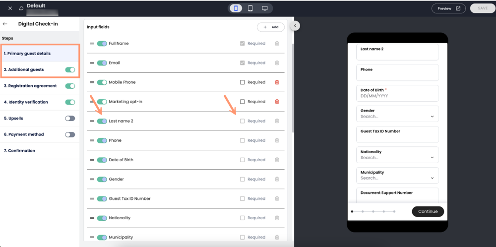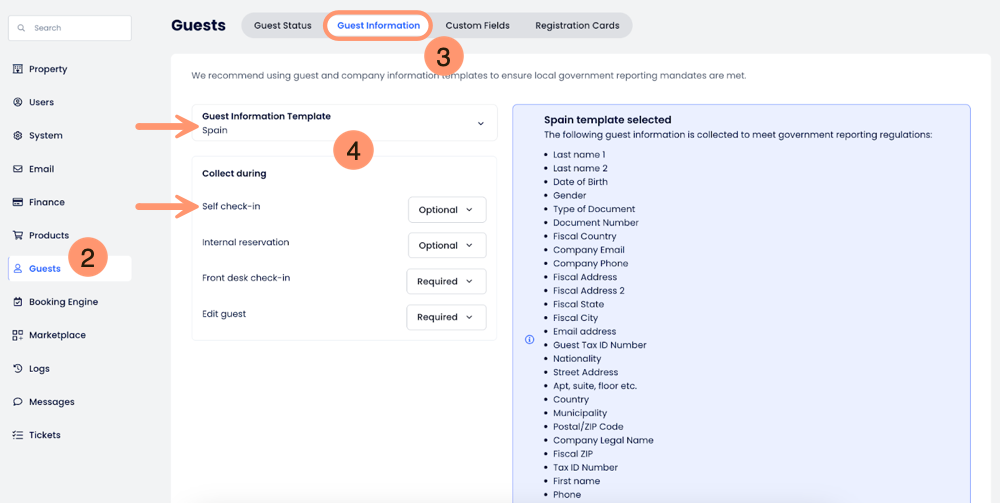 - Seçili Misafir Bilgileri Şablonu (örneğin, İspanya veya Portekiz) içinde, Self check-in dahil olmak üzere her zorunlu alanın ne zaman toplandığını kontrol edebilirsin.
