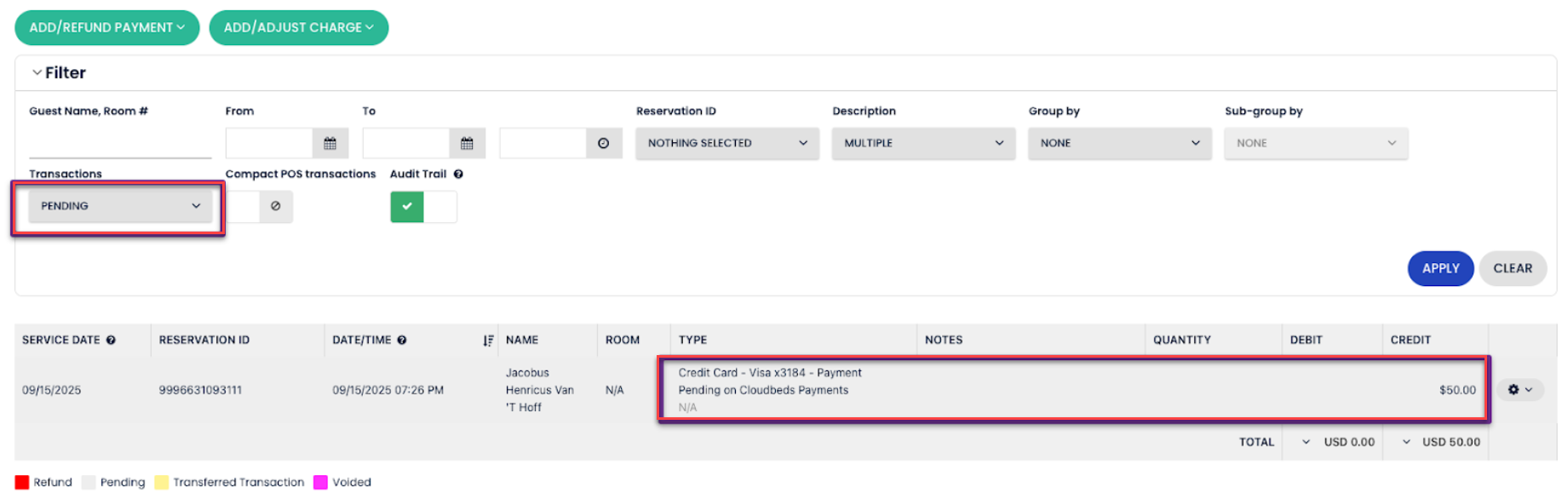 Misafirin işlem yapmasını beklerken, rezervasyon folyoda bir Beklemede İşlem görünür. Bu, banka doğrulaması tamamlanana kadar yer tutucu görevi görür.