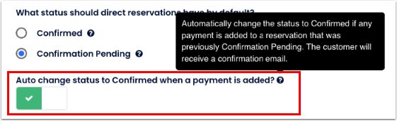 Önceden Onay Bekliyor durumunda olan bir rezervasyona herhangi bir ödeme eklendiğinde durumu Otomatik Olarak Onaylandı olarak değiştirmek için açın. Müşteri bir onay e-postası alacaktır.