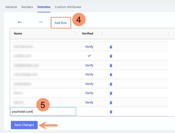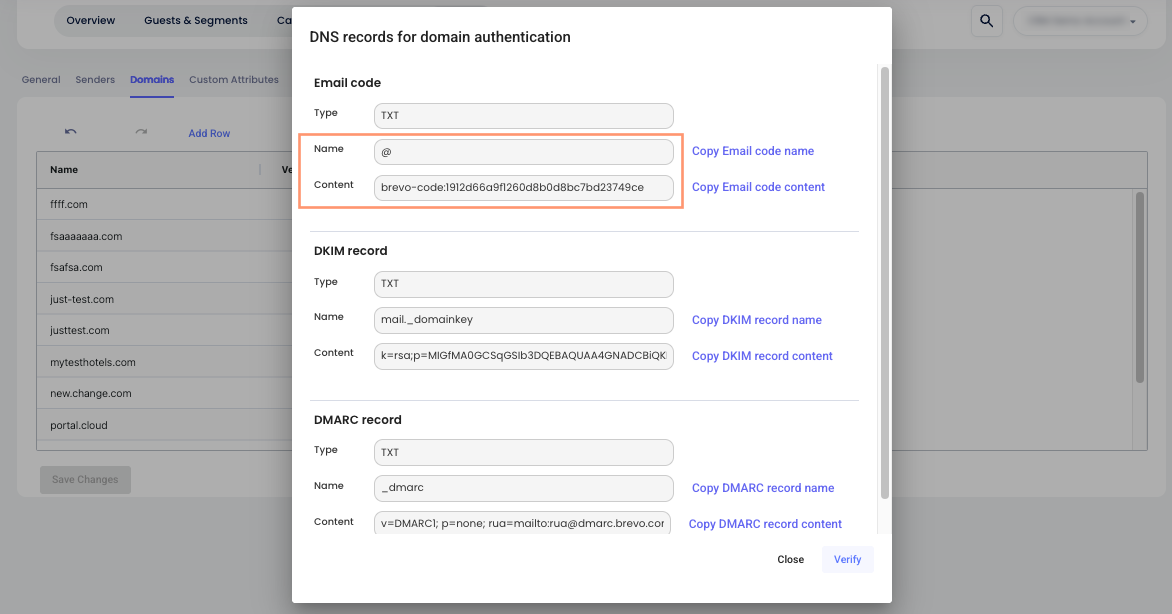 - Cloudbeds Alan Adları sekmesine dön ve doğrulama modal penceresi kapalıysa tekrar aç.