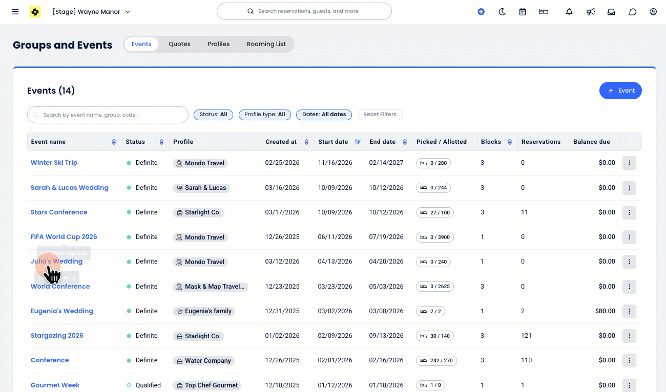 Cloudbeds, mevcut görevinle en iyi uyum sağlayan iş akışını seçmene olanak tanıyan üç esnek giriş noktası sunar. İster belirli bir etkinlik bloğunu yönetiyor ol, ister aynı anda birden fazla grup gelişini denetliyor ol, araca aşağıdaki yöntemlerle erişebilirsin:
