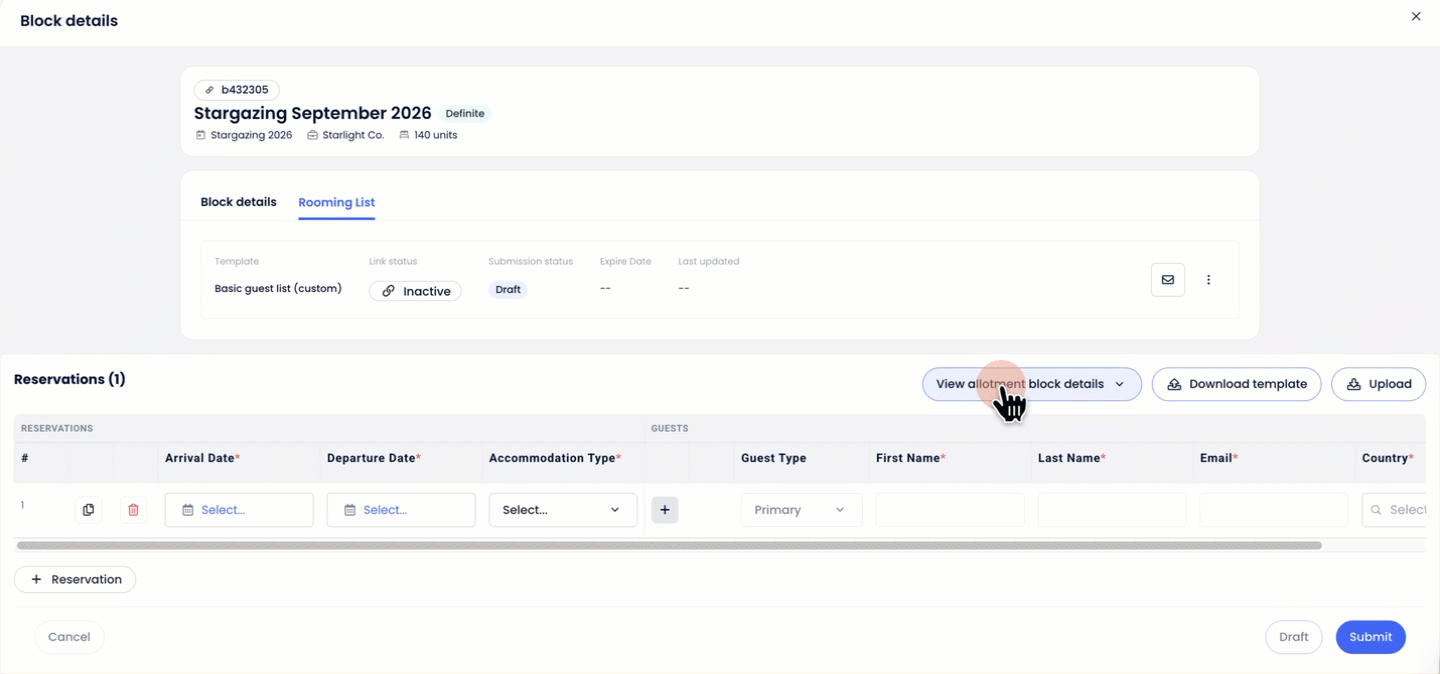 - Gönder: Liste tamamlandığında bunu kullan. Gönder’e tıklamak listeyi düzenlemeye kapatır ve Cloudbeds PMS’de bireysel rezervasyonların oluşturulmasını tetikler.