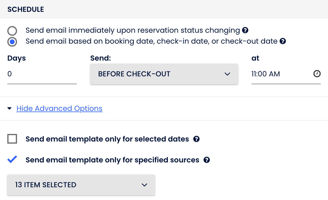 • Kanal Yöneticisi aracılığıyla alınan OTA rezervasyonları için ise, e-postalar yalnızca rezervasyon durumu değiştiğinde planlanır.