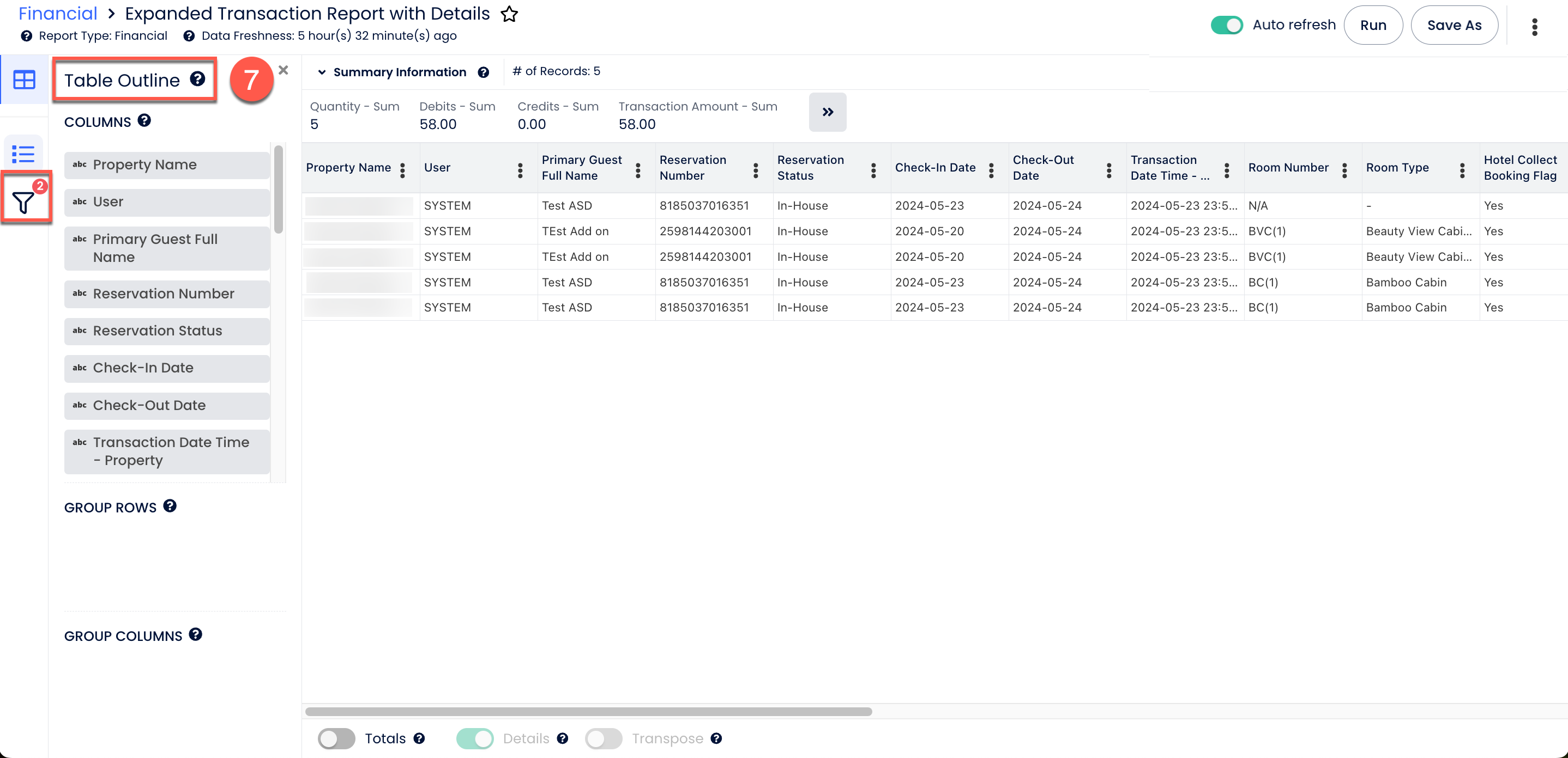 - Detaylar geçiş düğmesi AÇIK olduğunda, rapor özetlenen tablonun detaylı kayıt listesini gösterir.