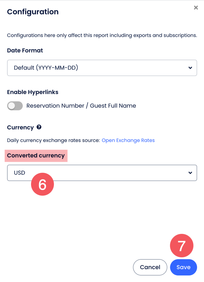 Cloudbeds Insights müşterileri sadece Kaydedilmiş Raporlar için Para Birimi Dönüşümü CDF'leri ekleyebilir ve para birimi yapılandırmasını değiştirebilir.
