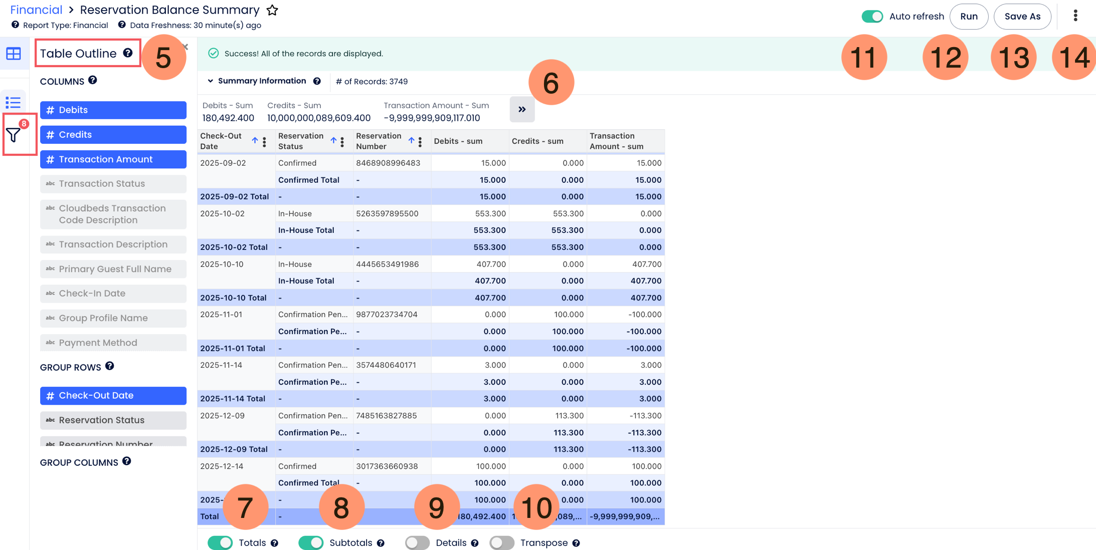 - Alt Toplamlar geçiş düğmesi AÇIK olduğunda, rapor her grup için özet toplamları gösterir. Bu seçenek yalnızca belirli gruplanmış rapor düzenlerinde mevcut olabilir.