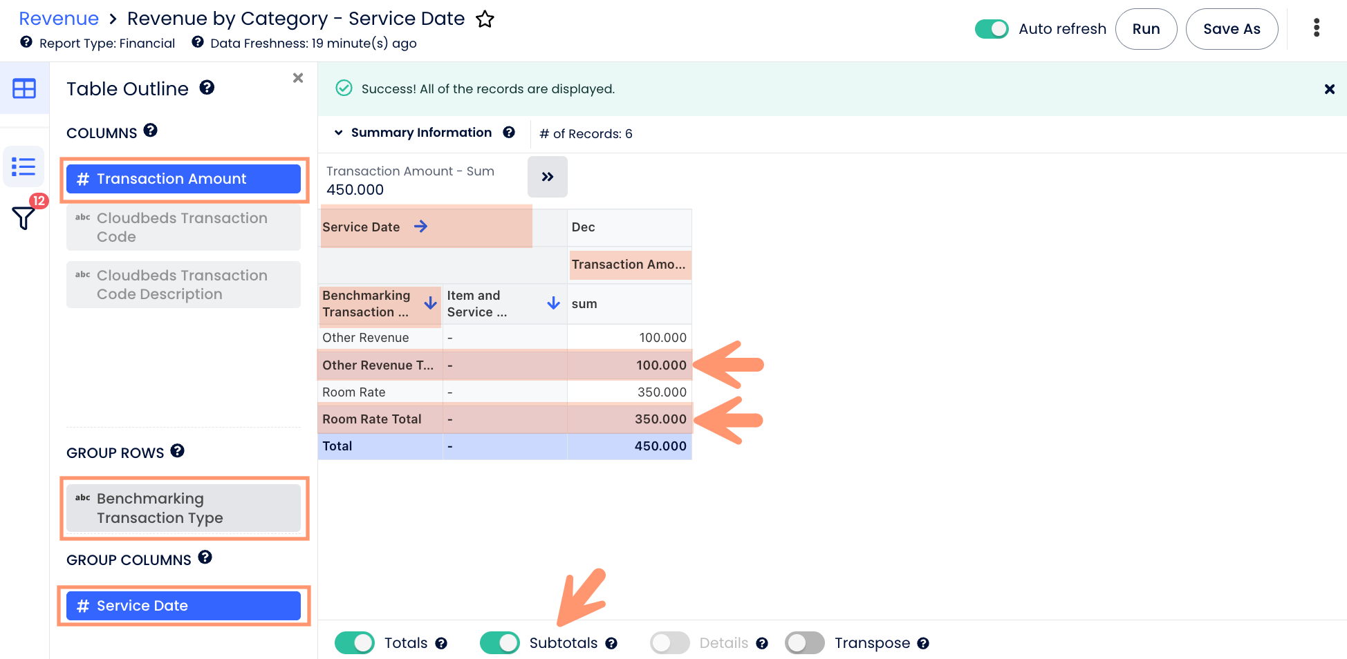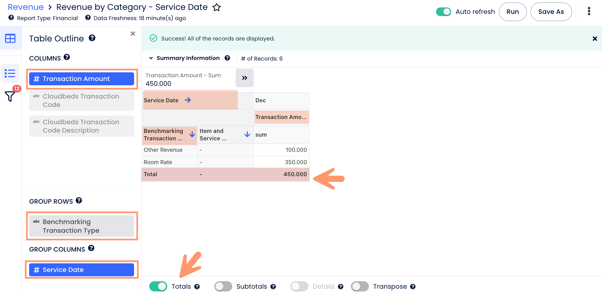 Tablo taslağı, raporu oluşturmak için gereken Cloudbeds Veri Alanları* sütunlarını eklemeni sağlar.
