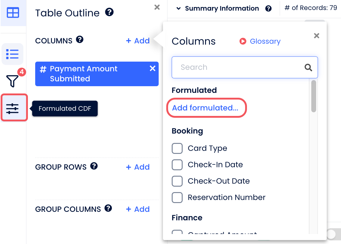 Raporu oluşturmak için bir veya birden fazla CDF seç, bu veri alanları tablo raporunda sütun olarak eklenecektir.