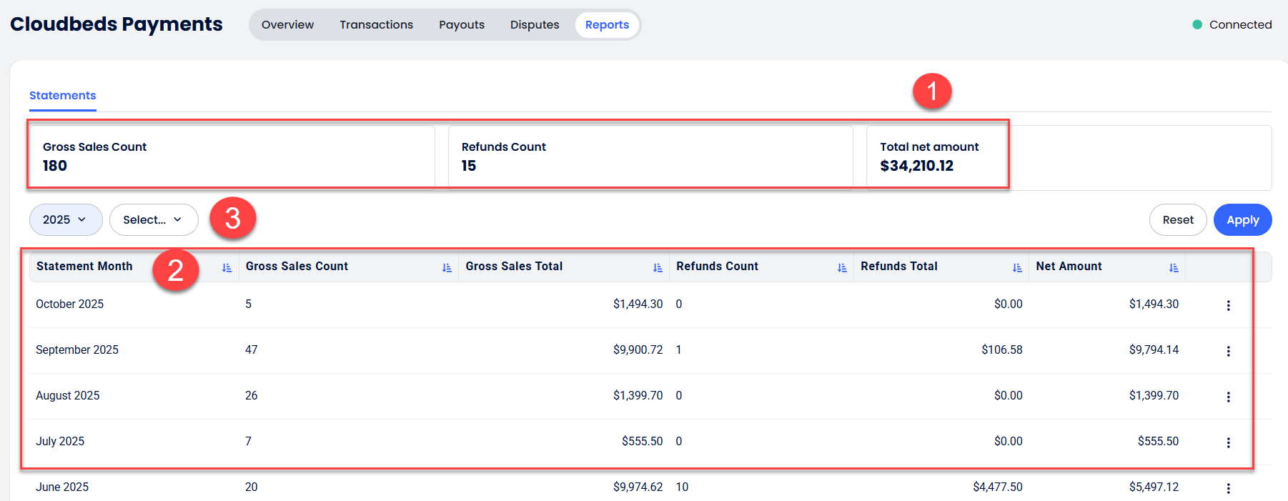 Aylık ekstre, Cloudbeds Payments kullanan üye işyerlerine yapılan ödemeler, iadeler, ters ibrazlar ve ücretler dahil olmak üzere, üye işyeri hesabınıza gönderilen tüm kredi kartı işlemlerini listeler.
