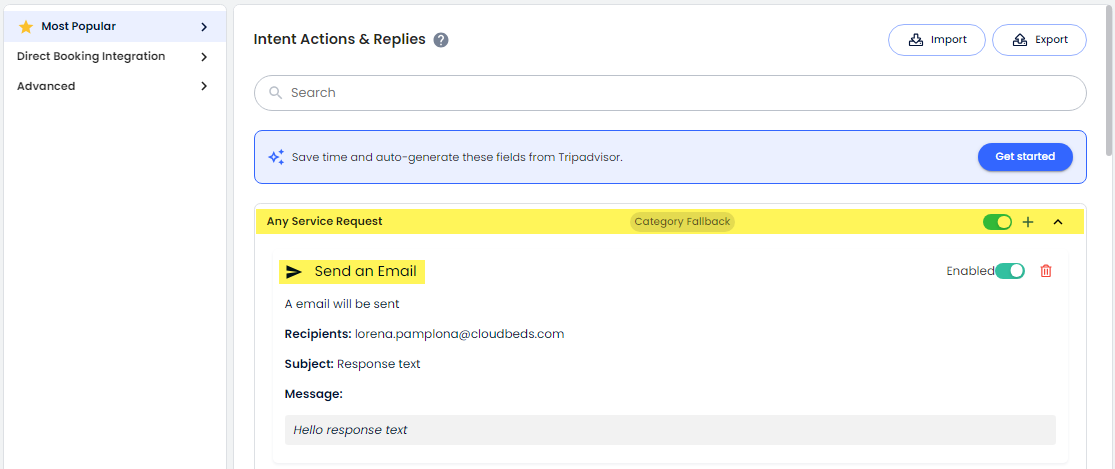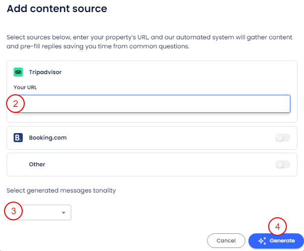 İçerik kaynaklarında, en popüler otel tabanlı yanıtların verilerine dayanarak otomatik oluşturulan yanıtları etkinleştirebilirsin, örneğin TripAdvisor.
