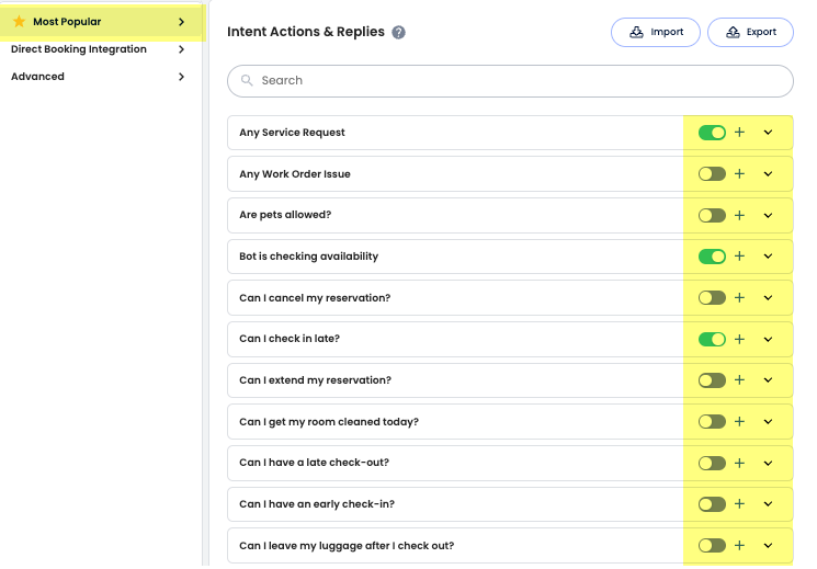 Bu sayfada, En Popüler, Doğrudan Rezervasyon Entegrasyonu ve Gelişmiş (kategoriye göre) olarak bölünmüş yüzlerce popüler soru bulunur. Her bölümü inceleyip yanıtları tesisin için özel olarak yapılandırabilirsin.