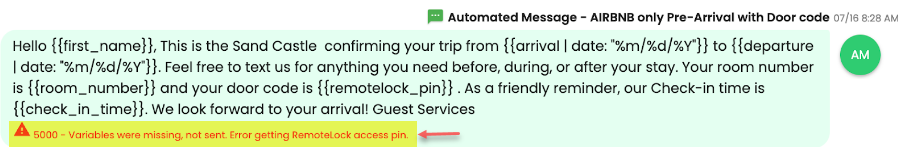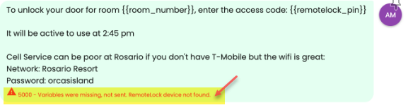 RemoteLock tarafından pinler verilirken doğrudan bir hata iletisi gösterilirse, misafire gönderilen mesajın altında onlardan gelen teşhis edilmiş hatayı aşağıdaki örneklerde olduğu gibi bulabilirsin: