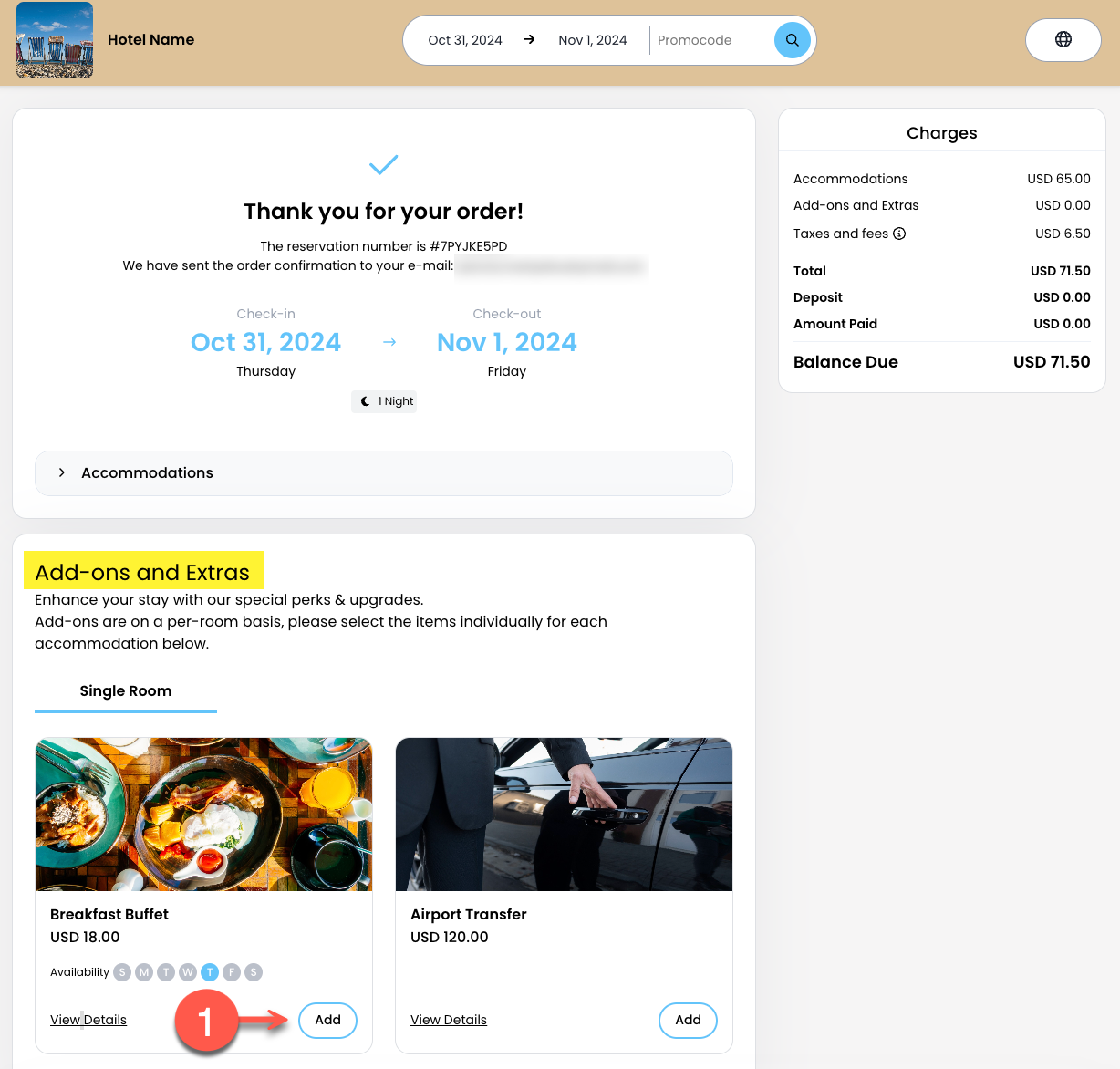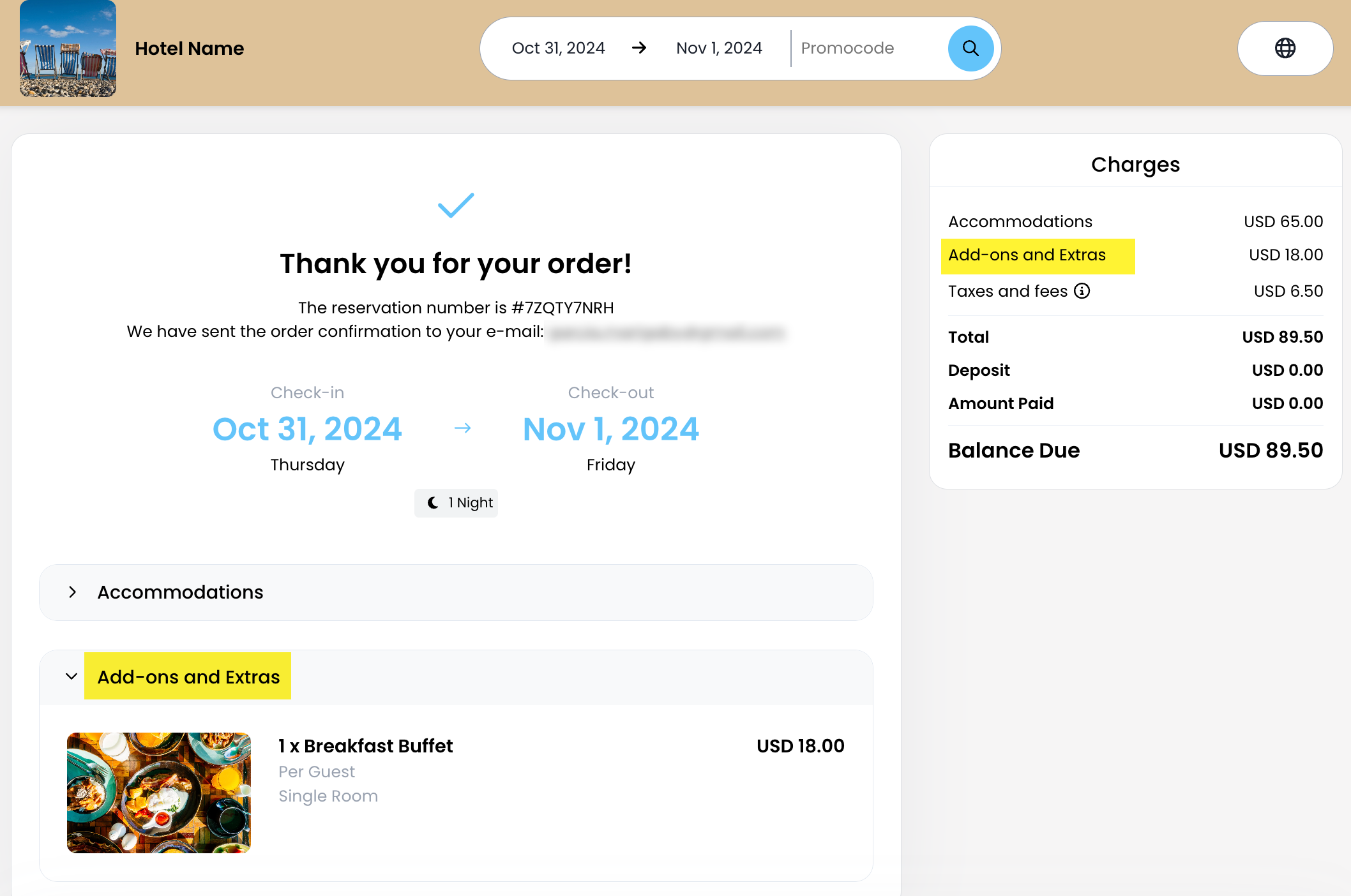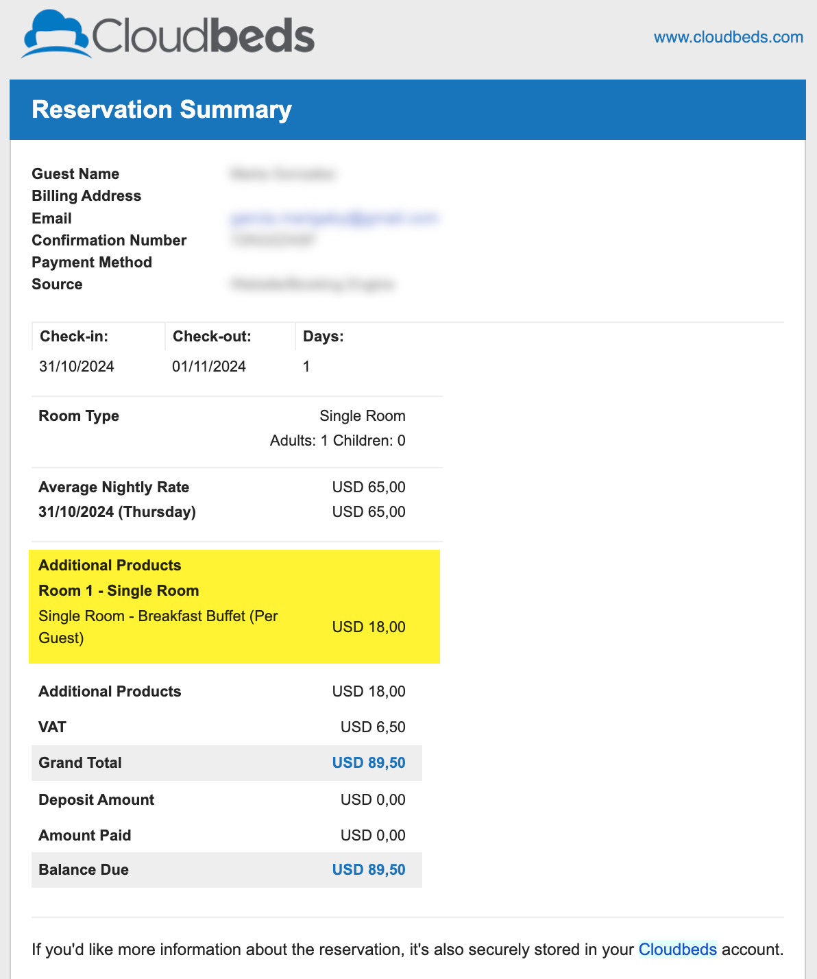 Misafir bir eklenti satın aldığında, Cloudbeds'ten rezervasyon özeti ve eklenti satın alımı ile ilgili bir e-posta alırsınız: