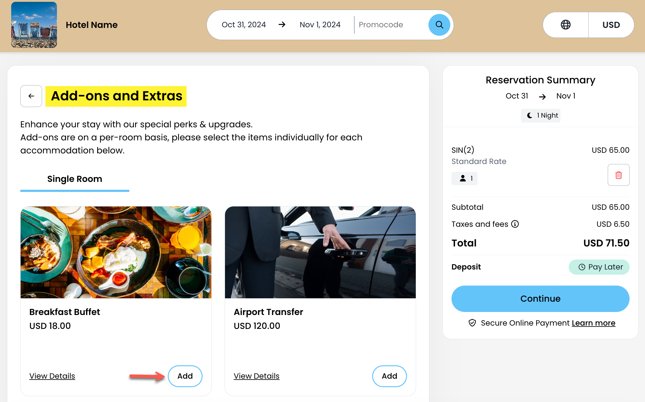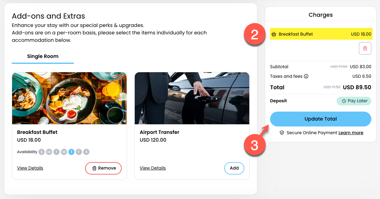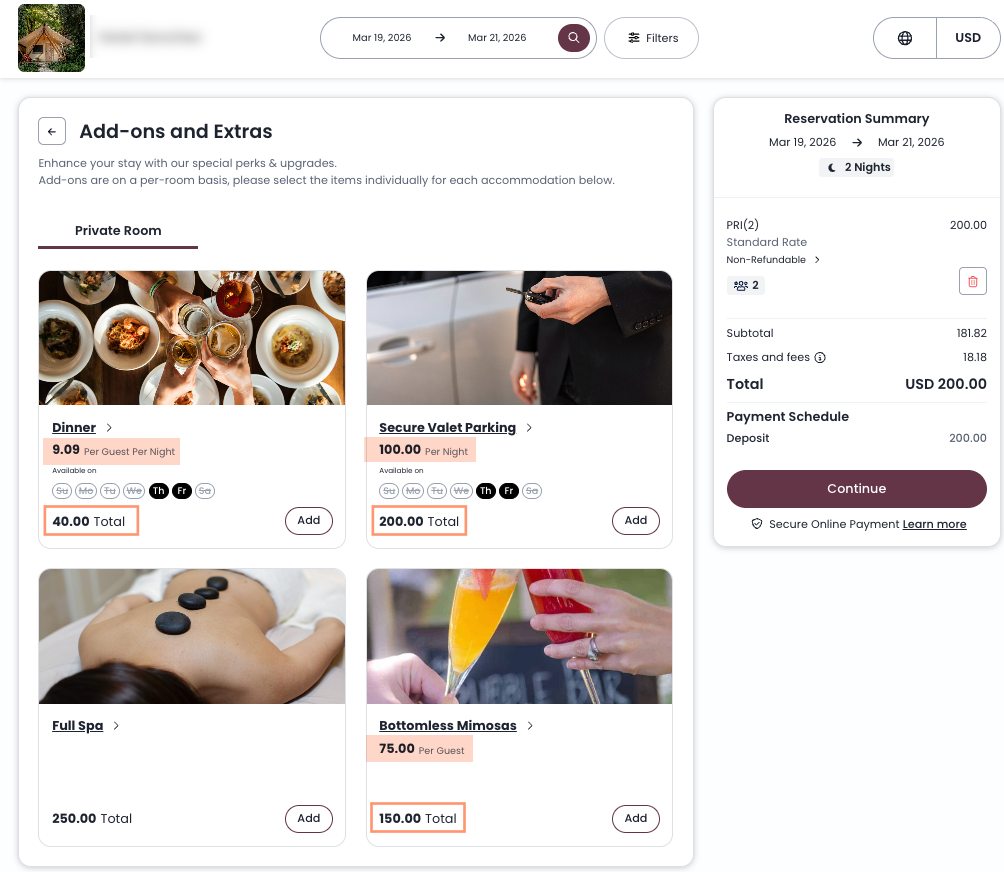 - Önemli: Eklentiler rezervasyon yapıldıktan sonra eklendiğinde, depozito tutarına dahil edilmez. Tesis, eklentileri rezervasyon tamamlanmadan önce satmayı seçerse, dahil edilirler.